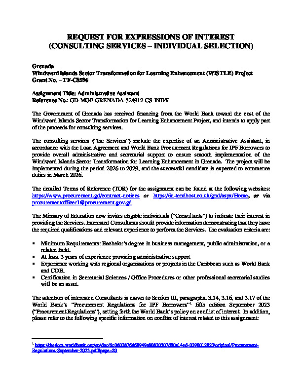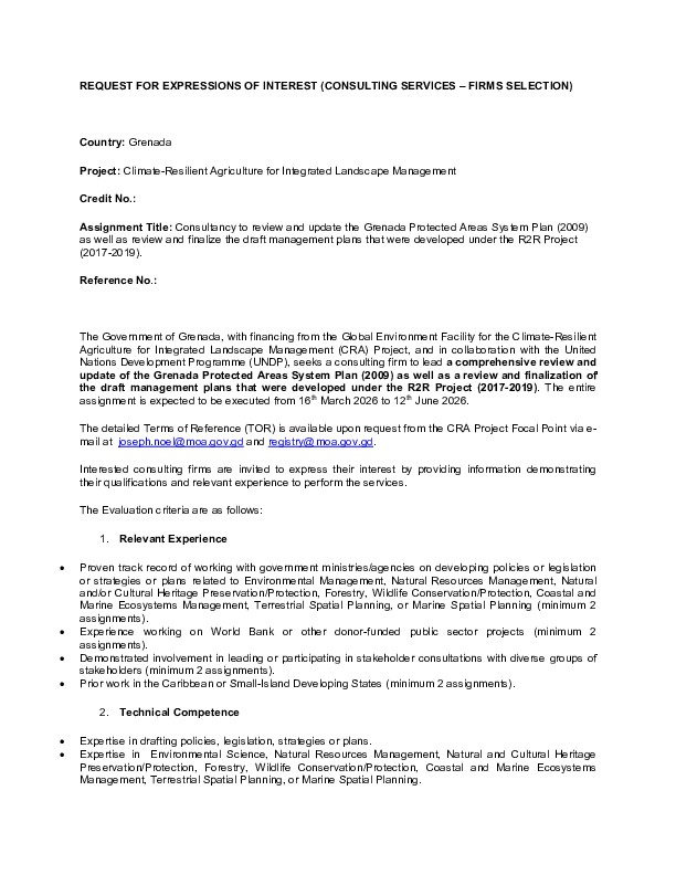 The Climate Risk Screening Specialist will be engaged in a fixed-price consultancy, expected to be implemented within two-man months, over three months. Expressions of Interest (including disclosure of any actual or potential conflict of interest) must be submitted with the headline GCF Readiness and Preparatory Support Programme - Climate Risk Screening Specialist on or before 2 pm AST, March 5th, 2026.