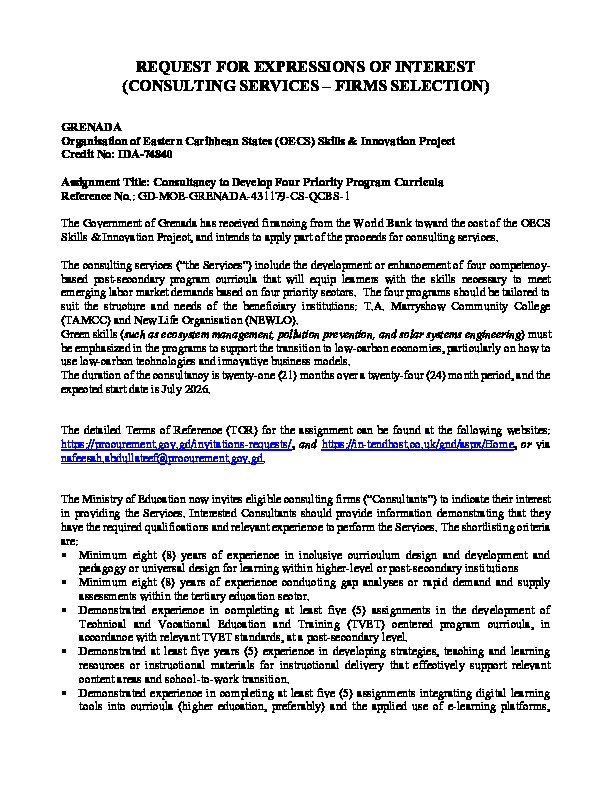 Windward islands Sector Transformation for Learning Enhancement (WISTLE) Project Grant No. – TF-C8596 The consulting services (“the Services”) include the expertise of an Administrative Assistant, in accordance with the Loan Agreement and World Bank Procurement Regulations for IPF Borrowers to provide overall administrative and secretarial support to ensure smooth implementation of the Windward Islands Sector Transformation for Learning Enhancement in Grenada. The project will be implemented during the period 2026 to 2029, and the successful candidate is expected to commence duties in March 2026.
