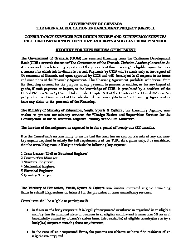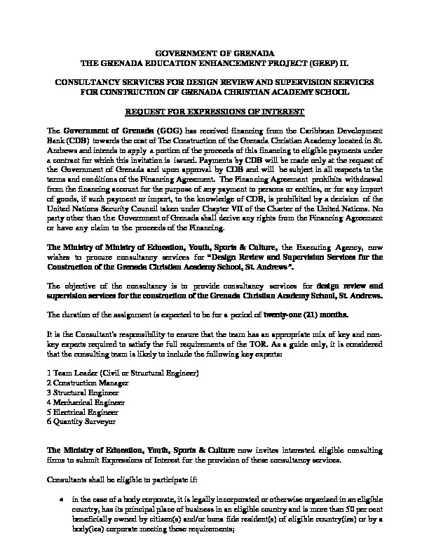 The Ministry of Ministry of Education, Youth, Sports & Culture, the Executing Agency, now wishes to procure consultancy services for “Design Review and Supervision Services for the Construction of the Grenada Christian Academy School, St. Andrews”.