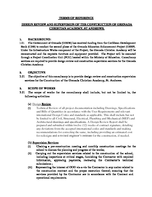 The objective of this consultancy is to provide design review and construction supervision services for the Construction of the Grenada Christian Academy, St. Andrews.