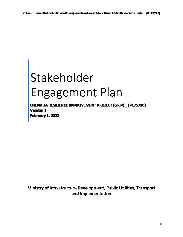 This Stakeholder Engagement Plan (SEP) outlines the schedule and mechanisms for stakeholder engagement, project information dissemination and grievance management for the life cycle of the Grenada Resilience Improvement Project (GRIP or Project) in Grenada.